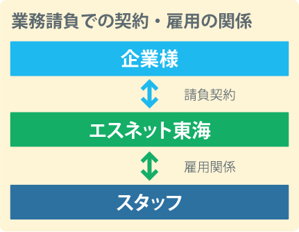 業務請負とは、企業様からエスネット東海に業務を発注して頂く事です。企業様は雇用をする必要がないので、永続的な人件費が発生しません。